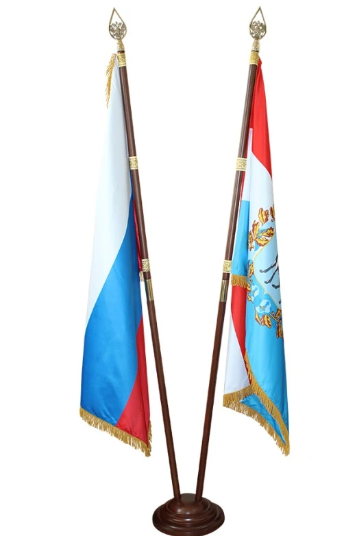 Изделия поставляются в комплекте. В состав комплекта входит: подставка напольная деревянная на 2 штока, знамя РФ печатное, знамя Самарской области печатное.