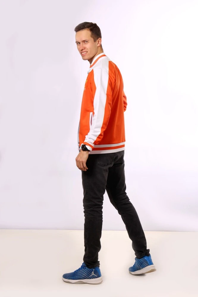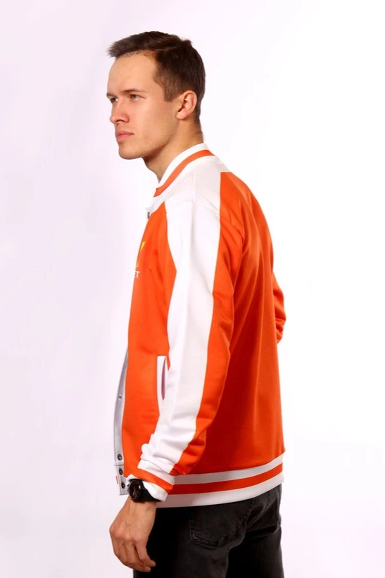Модель. Прямой силуэт, без капюшона, без подклада. Длинные рукава с манжетами из сублимационной ткани сандвич браш. Низ бомбера и воротник с закругленными углами также выполнены из сублимационной ткани сандвич браш. Вариант застежки бомбера на выбор: на семь металлических кнопок или на молнию. Два боковых кармана в листочку без молнии.