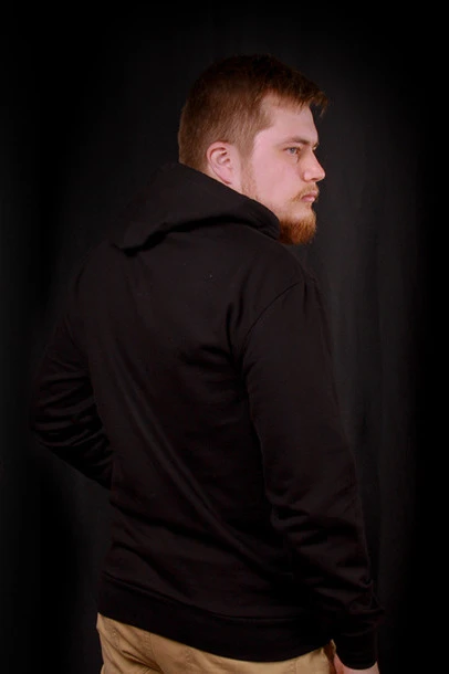 Модель. Толстовка унисекс с прямым силуэтом. Длинные рукава с манжетами. Манжеты рукавов и низ толстовки обработаны тканью рибана (специальная тканая резинка) в цвет толстовки. Толстовка с капюшоном и накладным карманом «кенгуру». В капюшон продет плоский шнур, у которого запаяны концевики. Капюшон с подкладом из кулирной глади в тон футера.