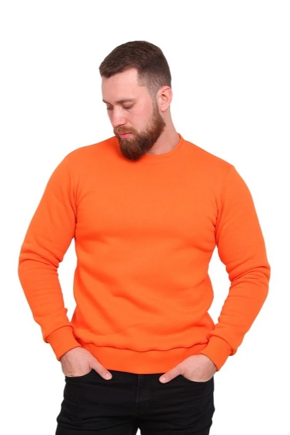 Модель. Прямой силуэт. Толстовка без молнии. Длинные рукава. Низ толстовки и рукавов, а также горловина обработаны тканью кашкорсе (специальная тканная резинка) в цвет толстовки. Толстовка без капюшона и карманов.