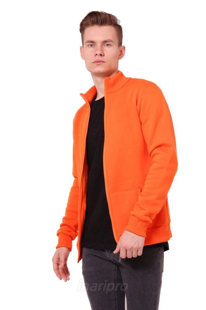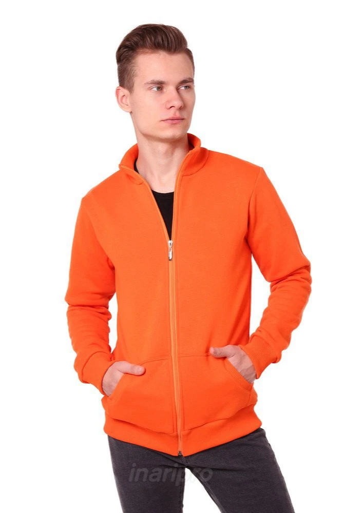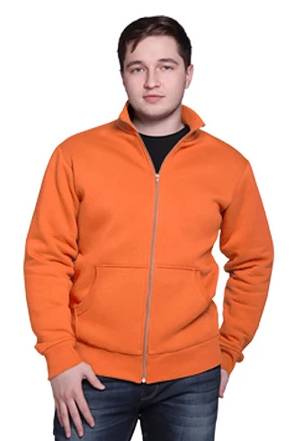Модель. Прямой силуэт. Толстовка на молнии. Длинные рукава. Низ толстовки и рукавов, а также горловина обработаны тканью кашкорсе (специальная тканая резинка) в цвет толстовки. Толстовка без капюшона. Два раздельных кармана по типу кенгуру. Для большего удобства при открывании и закрывании на молнии установлены пуллеры.