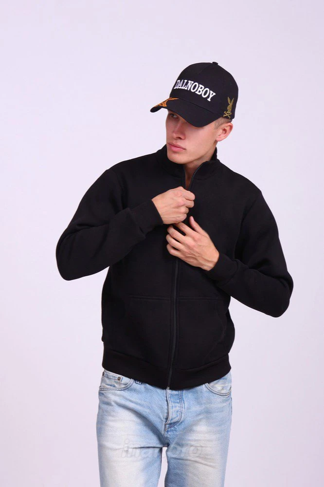 Модель. Прямой силуэт. Толстовка на молнии. Длинные рукава. Низ толстовки и рукавов, а также горловина обработаны тканью кашкорсе (специальная тканая резинка) в цвет толстовки. Толстовка без капюшона. Два раздельных кармана по типу кенгуру. Для большего удобства при открывании и закрывании на молнии установлены пуллеры.