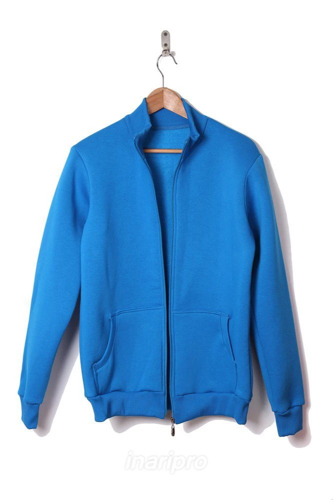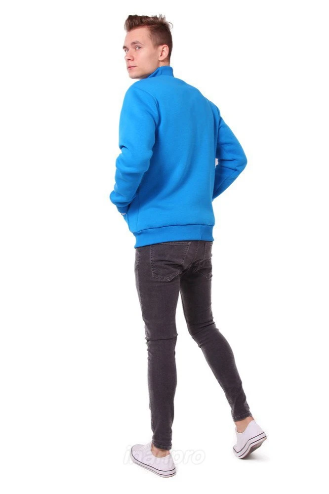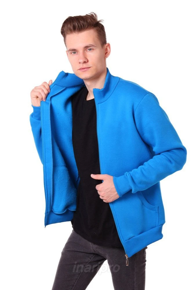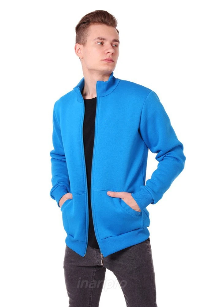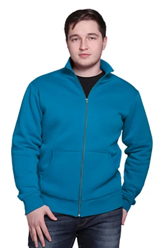 Модель. Прямой силуэт. Толстовка на молнии. Длинные рукава. Низ толстовки и рукавов, а также горловина обработаны тканью кашкорсе (специальная тканая резинка) в цвет толстовки. Толстовка без капюшона. Два раздельных кармана по типу кенгуру. Для большего удобства при открывании и закрывании на молнии установлены пуллеры.