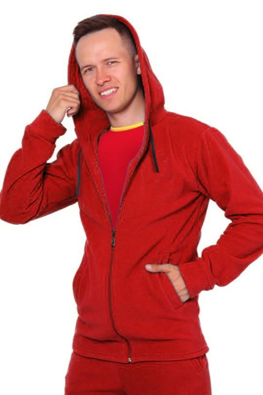 Модель. Прямой силуэт. Толстовка на молнии. Длинные рукава с манжетой из основного материала. Толстовка с пришивным капюшоном. У края капюшона продет плоский шнур стандартных цветов.  Два прорезных кармана в листочку без молнии.  Возможно бесплатное комбинирование деталей разных цветов (например, рукава могут отличаться по цвету от остальных деталей). Для большего удобства при открывании и закрывании на молнии установлены пуллеры.