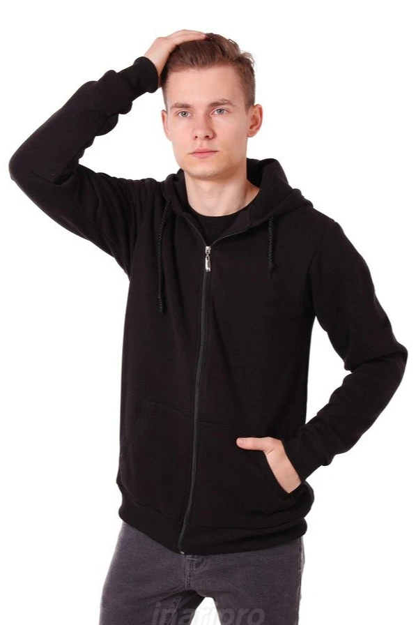 Модель. Балахон Рик прямого силуэта на молнии. Толстовка с длинными рукавами. По низу толстовки и рукавов прошита специальная тканная резинка кашкорсе в цвет балахона. Два раздельных кармана по типу кенгуру. Капюшон пришивной двухслойный, внутренний слой из однотонной кулирной глади с лайкрой стандартных цветов на выбор. У края капюшона продет плоский шнур стандартных цветов.