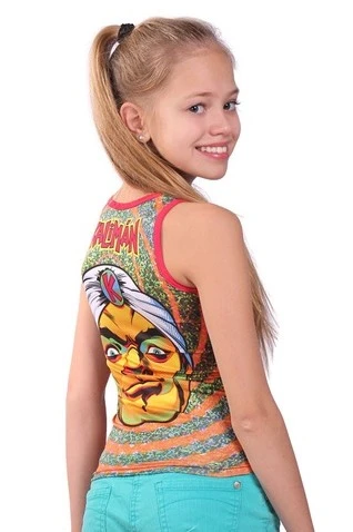 Модель. Майка с прямым силуэтом. Пройма рукавов и горловины обработаны руликом (кант из основной ткани). Майка имеет боковые швы без разрезов по низу изделия. Форма ворота О-образная.
