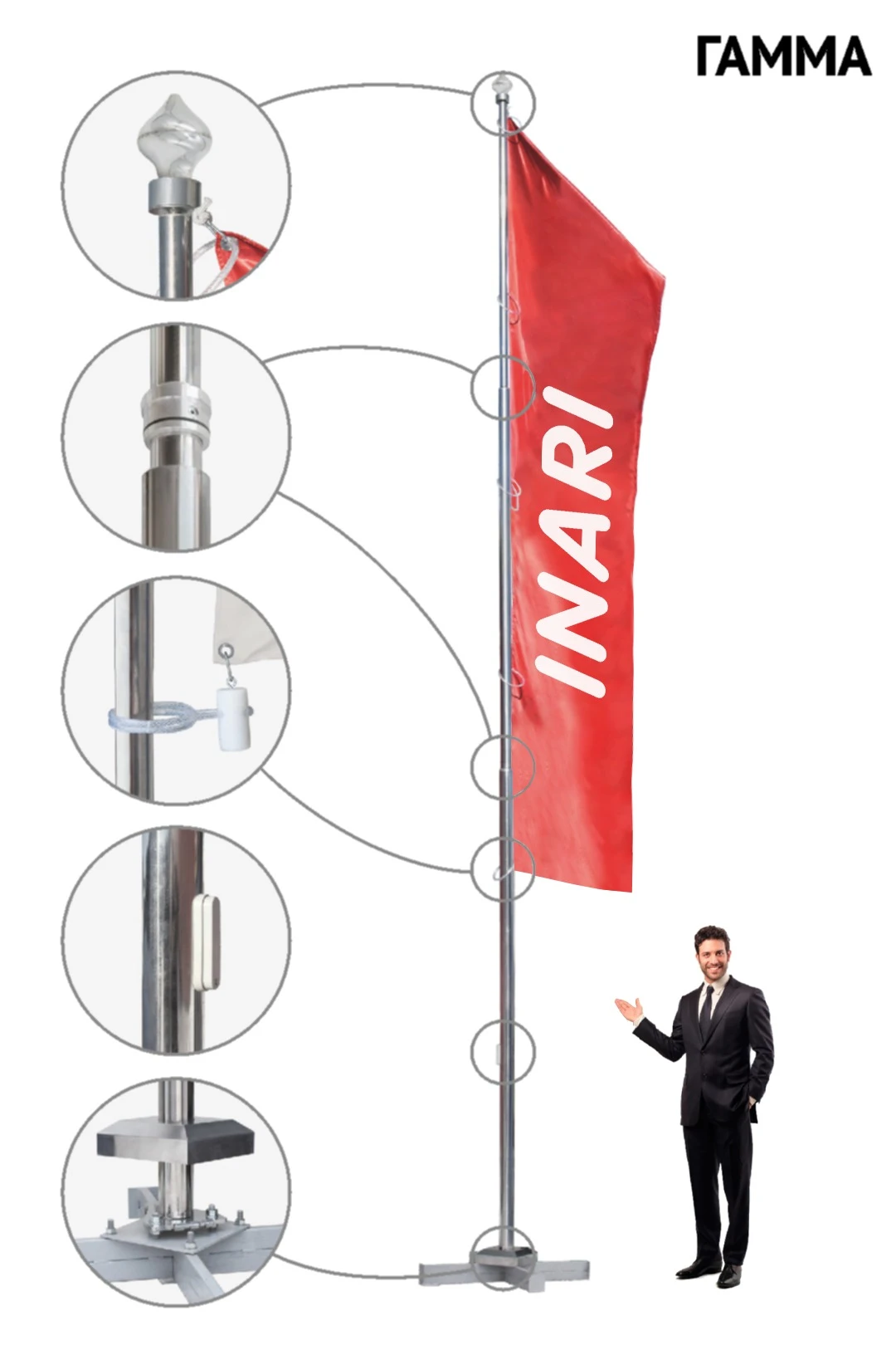 Флагшток из нержавеющей стали отличается прочностью, долговечностью и презентабельным внешним видом (благодаря зеркальной матовой поверхности). Флагшток устойчив к воздействию различных погодных условий, не ломается под порывами ветра, прост в эксплуатации и не требует тщательного ухода после установки. Флагшток от "Инари" собирается быстро и легко. В отличие от цельных конструкций флагштоков из нержавеющей стали, он имеет большую мобильность, поскольку состоит из нескольких секций. Флагштоки изготавливаются из нержавеющей стали AISI 304.