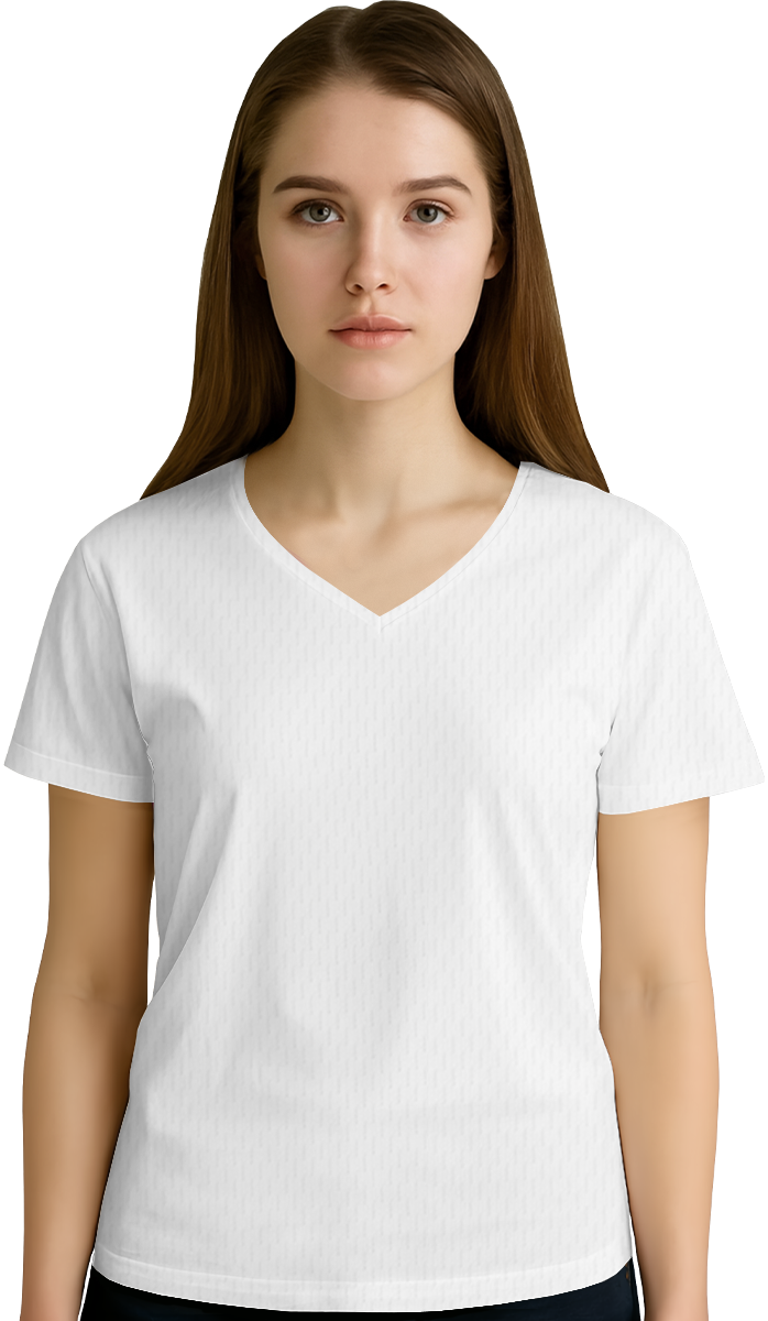 Модель. Приталенный силуэт. Футболка имеет боковые швы без разрезов по низу изделия. Оформление горловины руликом (кантом) из основной ткани или рибаной. Форма ворота V-образная.