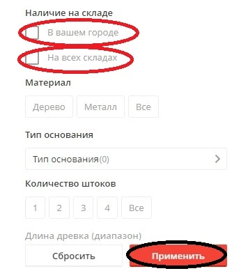 Далее в строке Наличие на складе вы выбираете нужный вам вариант, тут их 2, если вы хотите посмотреть количество товара на складе вашего города или общее количество товара. Нажимаем кнопку применить.