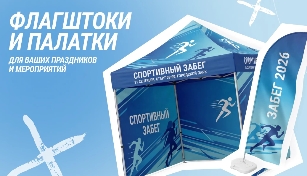 Например, брендированная палатка с логотипом и несколько флагштоков по периметру создают полноценную промо-зону, которая работает как точка притяжения.
